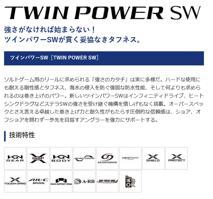 ソルトゲーム用のリールに求められる「強さのカタチ」は実に多様だ。ハードな使用にも耐える剛性感とタフネス、海水の侵入を防ぐ強固な防水性能、そして何よりも求められるのは巻き上げのパワー。新しいツインパワーSWはインフィニティドライブ、ヒートシンクドラグなどステラSWの強さを受け継ぐ機構を惜しげもなく搭載。オーバースペックとさえ言える卓越した巻き上げ力と耐久性がもたらす圧倒的な信頼感は、ショア、オフショアを問わず一歩先を目指すアングラーを強力にサポートする。