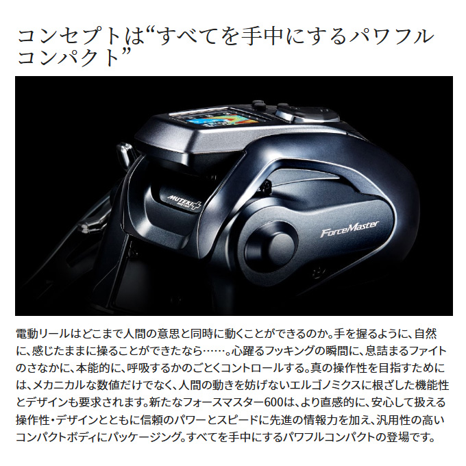 より直感的に、だれもが安心してコントロールでき、釣りの楽しさを広げ、深めることができる電動リールとは。その問いを追求・進化させたのがフォースマスター600シリーズ。