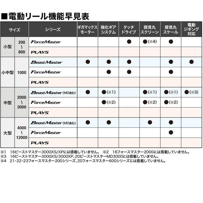 掛けた魚をバラさないをコンセプトに進化したタッチドライブスピードロック。どのような姿勢でも瞬時の電動アワセを可能にするフッキングモード。フォールスピードのコントロールを可能にするNEWフォールレバー。これら新機能を搭載することで、巻く、フォールで誘う、両面における電動リールの操作性を新次元へとアップグレードしました。心臓部はパワーとスピードに優れるMUTEKIモーター+に加え、最大ドラグ力は25%アップの10kg。また釣り人へのインフォメーションとなるディスプレイをカラー化し、海中の情報を伝える探見丸スクリーンを搭載。糸巻量PE2号300m/PE3号200mはタチウオ、コマセマダイ、青物など汎用性が高く、全国津々浦々、様ざまなフィールドで多彩な魚種に対応。
