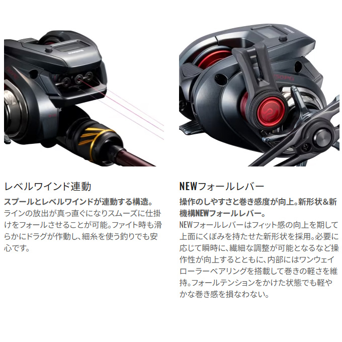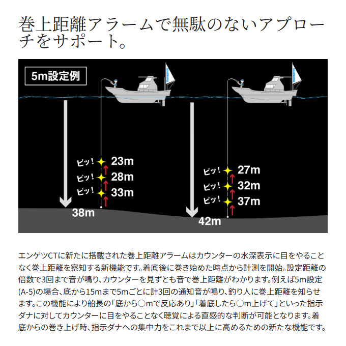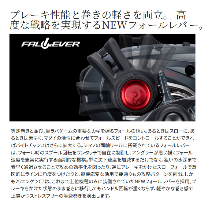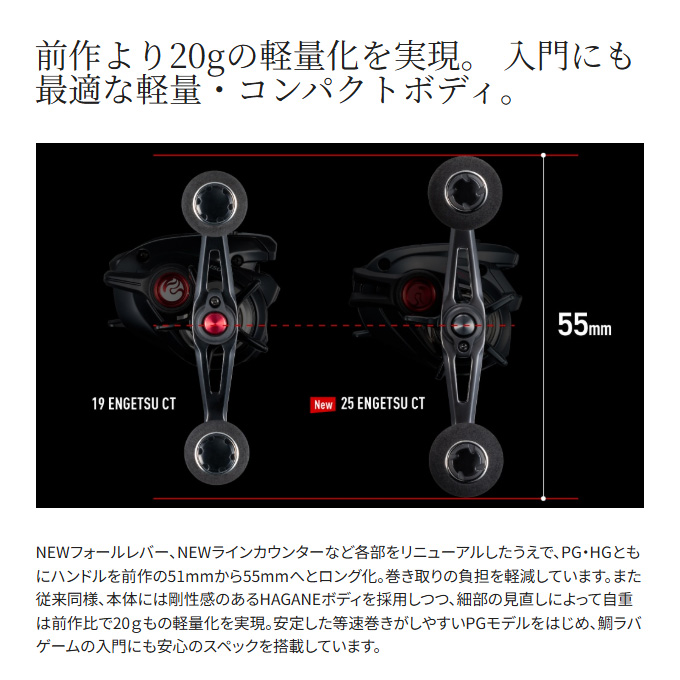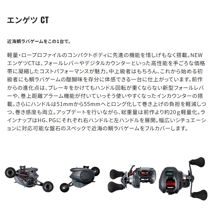 軽量・ロープロファイルのコンパクトボディに先進の機能を惜しげもなく搭載。エンゲツCTは、フォールレバーやデジタルカウンターといった高性能を手ごろな価格帯に凝縮したコストパフォーマンスが魅力。中上級者はもちろん、これから始める初級者にも鯛ラバゲームの醍醐味を存分に体感できる一台に仕上がっています。前作からの進化点は、ブレーキをかけてもハンドル回転が重くならない新型フォールレバーや、巻上距離アラーム機能が付いていっそう使いやすくなったインカウンターの搭載。さらにハンドルは51mmから55mmへとロング化して巻き上げの負担を軽減しつつ、巻き感度も両立。アップデートを行いながら、総重量は前作より約20g軽量化。ラインナップはHG、PGにそれぞれ右ハンドルと左ハンドルを展開。幅広いシチュエーションに対応可能な盤石のスペックで近海の鯛ラバゲームをフルカバーします。