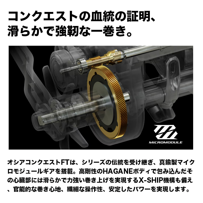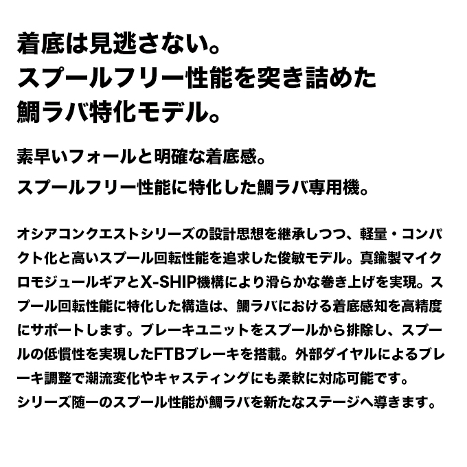 オシアコンクエストシリーズの設計思想を継承しつつ、軽量・コンパクト化と高いスプール回転性能を追求した俊敏モデル。真鍮製マイクロモジュールギアとX-SHIP機構により滑らかな巻き上げを実現。スプール回転性能に特化した構造は、鯛ラバにおける着底感知を高精度にサポートします。ブレーキユニットをスプールから排除し、スプールの低慣性を実現したFTBブレーキを搭載。外部ダイヤルによるブレーキ調整で潮流変化やキャスティングにも柔軟に対応可能です。シリーズ随一のスプール性能が鯛ラバを新たなステージへ導きます。