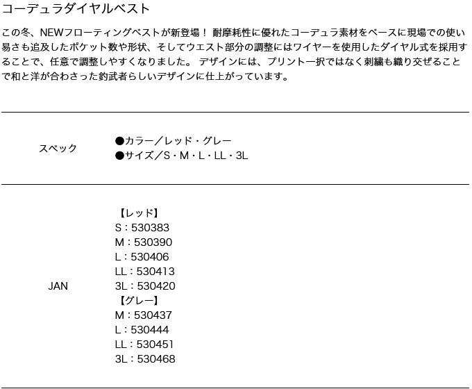 この冬、NEWフローティングベストが新登場! 耐摩耗性に優れたコーデュラ素材をベースに現場での使い易さも追及したポケット数や形状、そしてウエスト部分の調整にはワイヤーを使用したダイヤル式を採用することで、任意で調整しやすくなりました。 デザインには、プリント一択ではなく刺繍も織り交ぜることで和と洋が合わさった釣武者らしいデザインに仕上がっています。