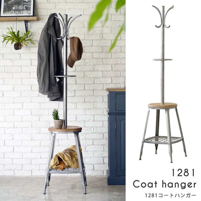 スチールの上にハンガーが付いたようなデザインは、板座面にポケットの小物を置いたり、下の棚には靴を置いたりと、機能性にこだわったコートハンガーです。