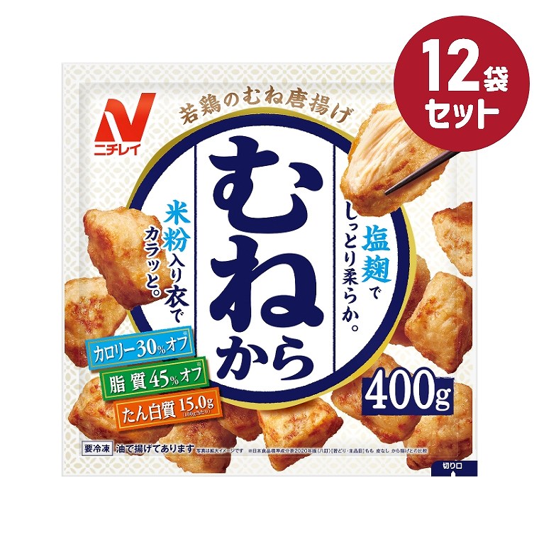 | 鶏肉(むね)、しょうゆ、みりん、でん粉、にんにくペースト、小麦粉、塩こうじ、ホエイパウダー、粉末鶏卵、粉末状植物性たん白、衣(でん粉、小麦粉、しょうゆ、しょうゆ加工品、食塩、ぶどう糖、植物油脂、米粉、香辛料、ホエイパウダー、粉末状植物性たん白、粉末卵白、粉末鶏卵)、揚げ油(パーム油)/加工でん粉、調味料(アミノ酸等)、クエン酸Na、乳化剤、炭酸Na、増粘多糖類、香料、(一部に小麦・卵・乳成分・大豆・鶏肉を含む) |