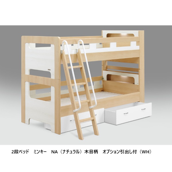 Granz (グランツ) 2段ベッド ミンキー 2色対応:NA/WH オーク柄プリント紙化粧繊維板/スチール 2段棚・1口コンセント・LED照明付 下段2段階調節可能 オプション:引出し、カラーパネル、ぬいラックあり 送料無料 (玄関前まで) 北海道・沖縄・離島はお見積り。やわらかい木目調のナチュラルとホワイトから選べ、便利な照明棚付の2段ベッドです。