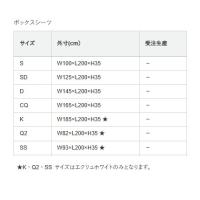 | サイズ | ボックスシーツ ■Sサイズ:W100×L200×H35cm ■SDサイズ:W125×L200×H35cm ■Dサイズ:W145×L200×H35cm ■CQサイズ:W165×L200×H35cm ■Kサイズ:W185×L200×H35cm ■Q2サイズ:W82×L200×H35cm ■SSサイズ:W93×L200×H35cm |