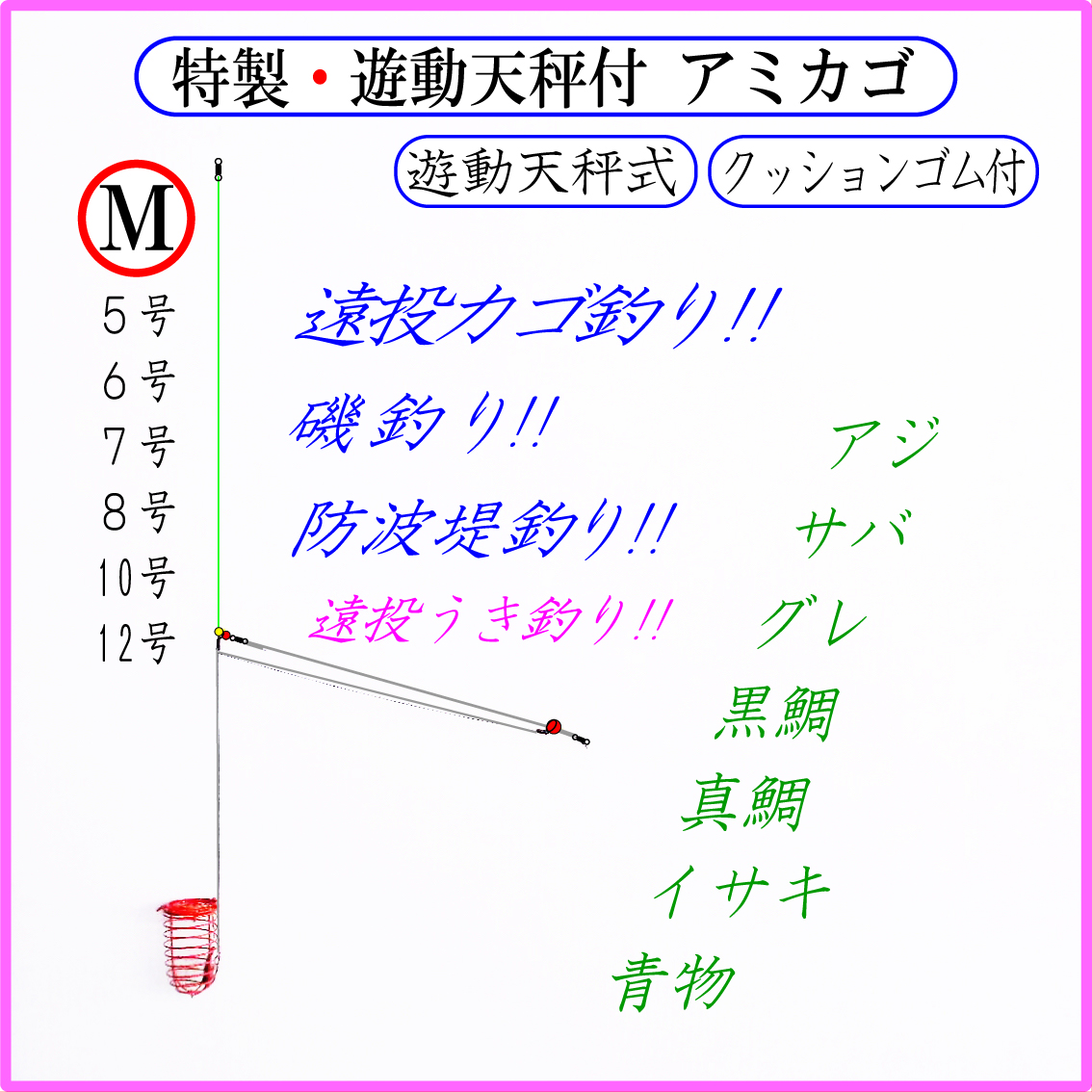 【特製・遊動天秤付 アミカゴ M(赤)クッションゴム付】遠投カゴ釣り仕掛け 磯 防波堤 コマセカゴ マキエカゴ アジ グレ メジナ サバ イサキ マダイ