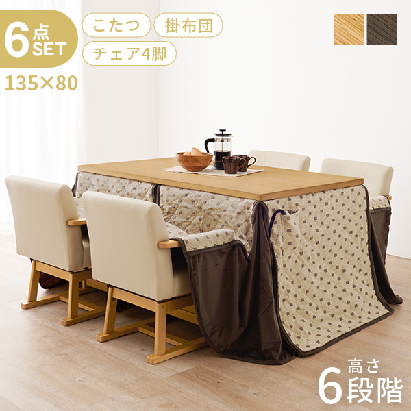 こたつ ハイタイプ セット こたつテーブル 135 ダイニングこたつ 高さ調節 こたつセット 長方形 コタツセット 6点 135×80 ミンカ+トルタ