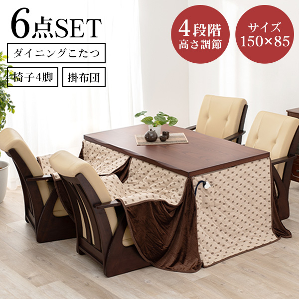 ダイニングこたつ こたつ布団 長方形 こたつテーブルセット コタツ ハイタイプ 高さ調節 おしゃれ 6点セット 150×85cm 山城 トルタ