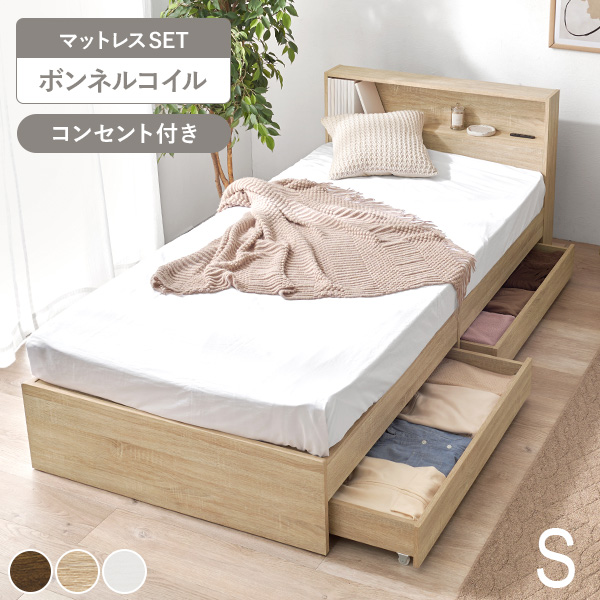 ベッド ベッドフレーム マットレス付き シングル 収納 すのこベッド 宮付き コンセント付き ベット 耐荷重350kg 収納付き ポケットコイル