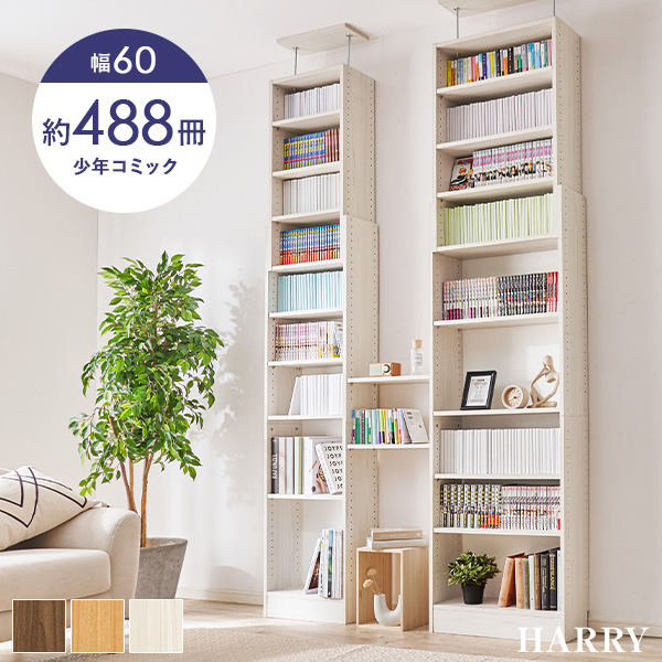 本棚 大容量 スリム 多機能 幅60 薄型 突っ張り棚 ラック 収納 オープンラック コミックラック おしゃれ 白 漫画 突っ張りラック ハリー