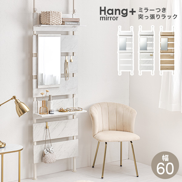 突っ張りラック 突っ張り棚 突っ張り棒 棚 ミラー付き 壁面収納 突っ張り スリム トイレ キッチン おしゃれ リビング 北欧 一人暮らし 幅60cm ハングミラー