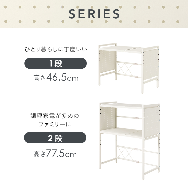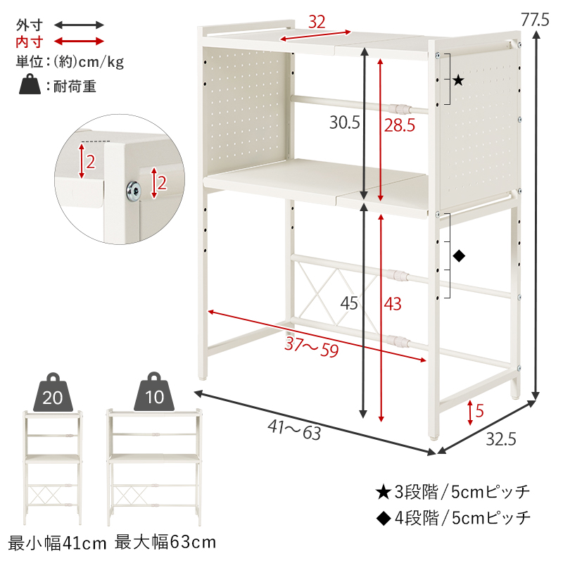 横幅は41〜63cmまでスライドし、上下の棚は高さを変えられます。