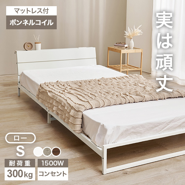 ベッド ベッドフレーム マットレス付き シングル 収納 パイプベッド シングルベッド 安い 宮付き コンセント付 ボンネルコイル 耐荷重300kg ロータイプ 頑丈
