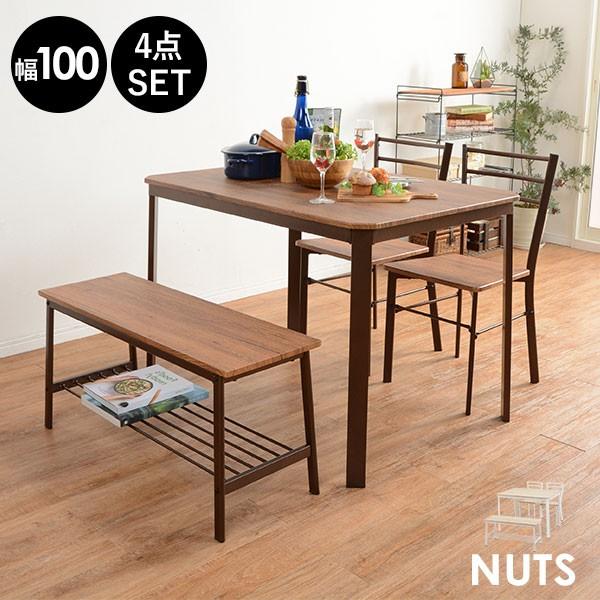ダイニングテーブルセット 4人用 4人 おしゃれ 北欧 白 安い ベンチ アイアン 食卓テーブルセット 食卓テーブル4人用 4点 長方形 椅子 幅100cm ナッツ