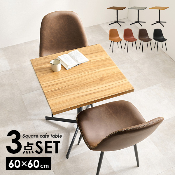 カフェテーブルセット 60cm 四角 カフェ風 ダイニングテーブルセット 2人 テーブル 正方形 おしゃれ 木目 石 レザー風 ヴィンテージ チェア