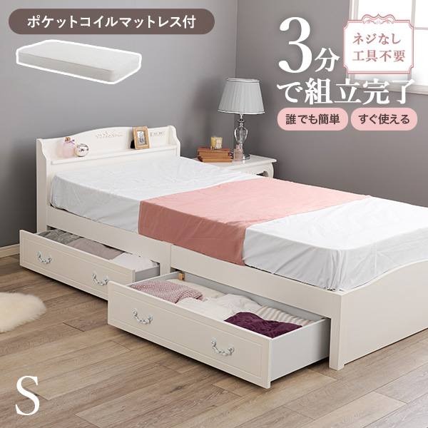 ベッド ベッドフレーム マットレス付き シングル 姫系 可愛い 白 収納付き 収納ベッド お姫様ベッド プリンセス すのこ ポケットコイル 組み立て簡単 ネジレス