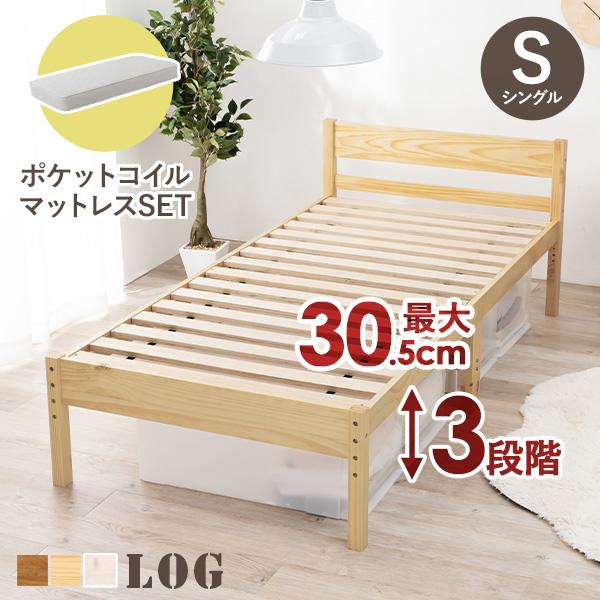 ベッド シングル マットレス付き ベッドフレーム すのこ 木製 コンセント マットレス 高さ調節 安い 木製 白 ベット ボンネスコイル ログ