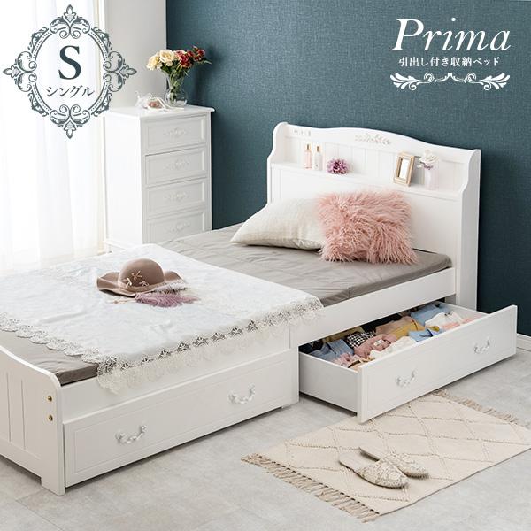 ベッド シングル 可愛い かわいい 白 収納 引出し 引き出し 姫系 木製 すのこ 棚 コンセント付き 布団 ふとん 敷き布団 プリマ