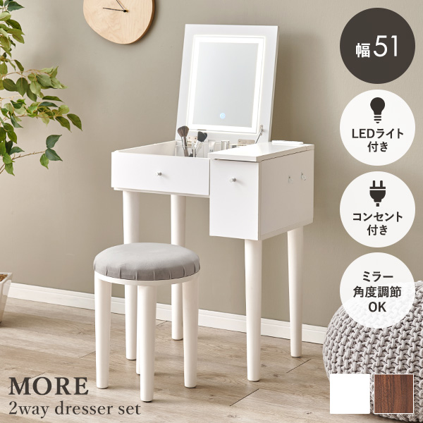 ドレッサー 化粧台 おしゃれ 収納 デスク 白 LEDライト ドレッサーデスク 鏡台 スツール付き セット 2way 一人暮らし コンセント モア