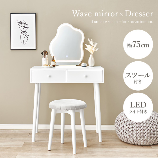 ドレッサー おしゃれ ライト付き 北欧 ドレッサーセット LEDライトミラー ウェーブミラー 韓国 白 韓国インテリア ホワイト 化粧台 スツール付き