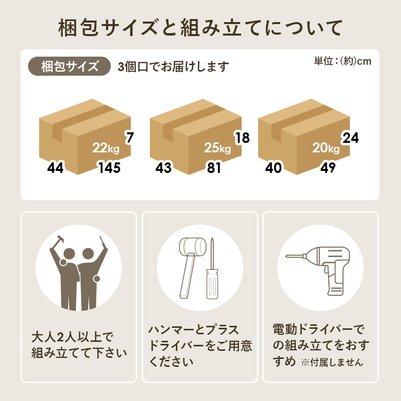 【梱包サイズ(約)】145×44×7cm(21.5kg)/81×43×17.5cm(25.1kg)/49×39.5×24cm(20kg)