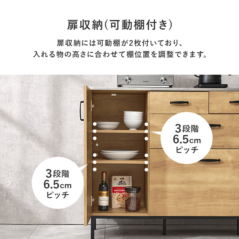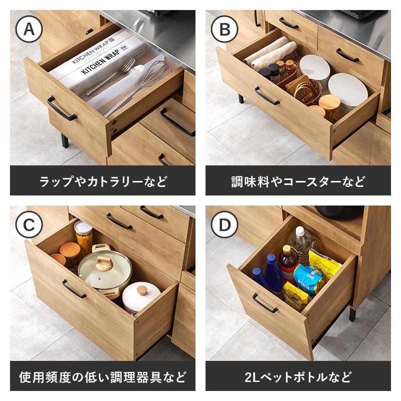 調味料や食品ストックなどを隠して収納できます。