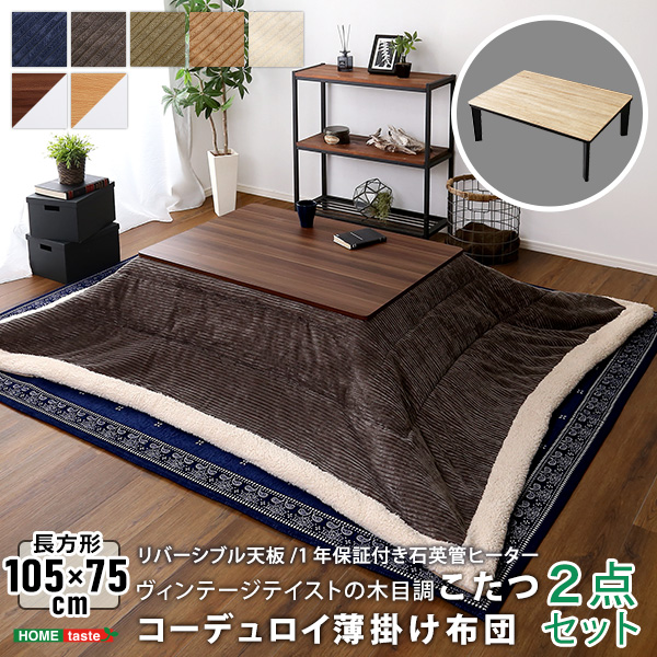 ヴィンテージテイストの木目調カジュアルこたつ布団セット コーデュロイ 長方形 105×75cm幅 おしゃれこたつ ヴィンテージ 北欧 炬燵 掛け布団 オールシーズン