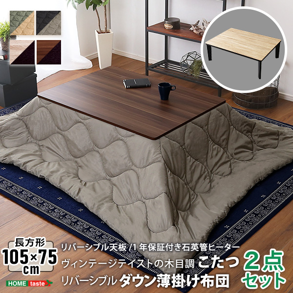 ヴィンテージテイストの木目調カジュアルこたつ布団セット ダウン 長方形 105×75cm幅 おしゃれこたつ ヴィンテージ 北欧 炬燵 掛け布団 オールシーズン