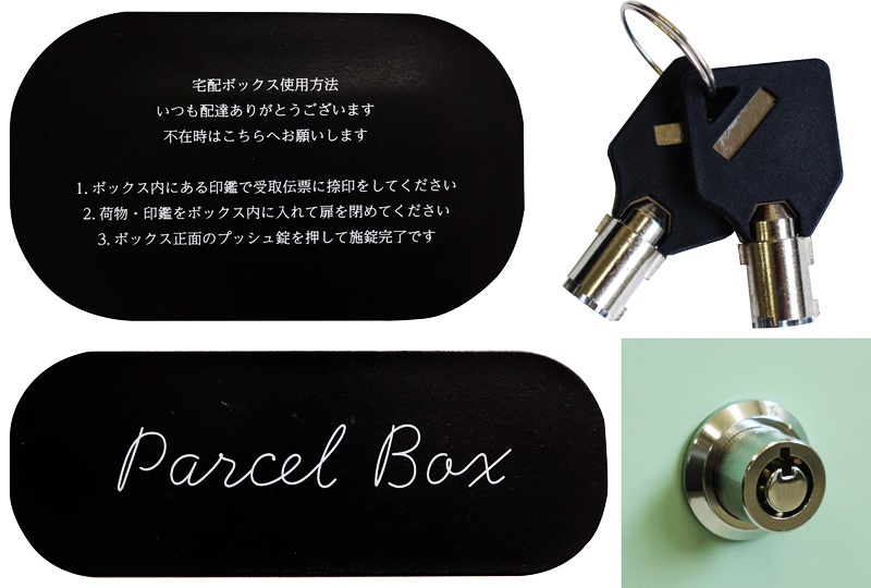 ・キー、アンカーボルト、キーフック付印鑑ケース、宅配業者用の配達マニュアルが付属しており、お客様で追加でご用意頂くものは特に必要なく、すぐにご使用頂けます。