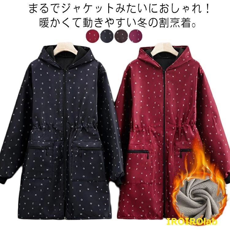 おしゃれも暖かさも妥協しないフード付き裏フリース割烹着。