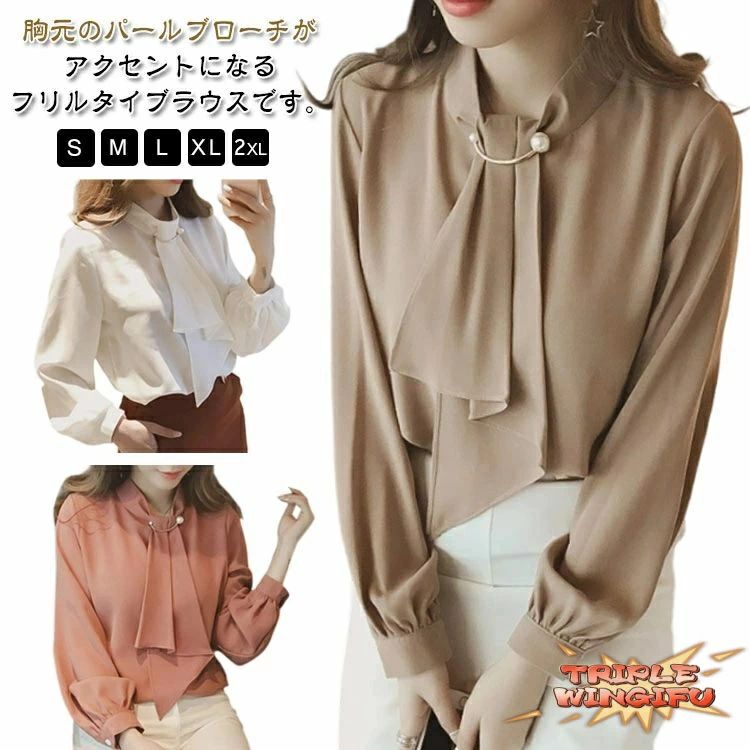 胸元のパールブローチがアクセントになるフリルタイブラウスです。