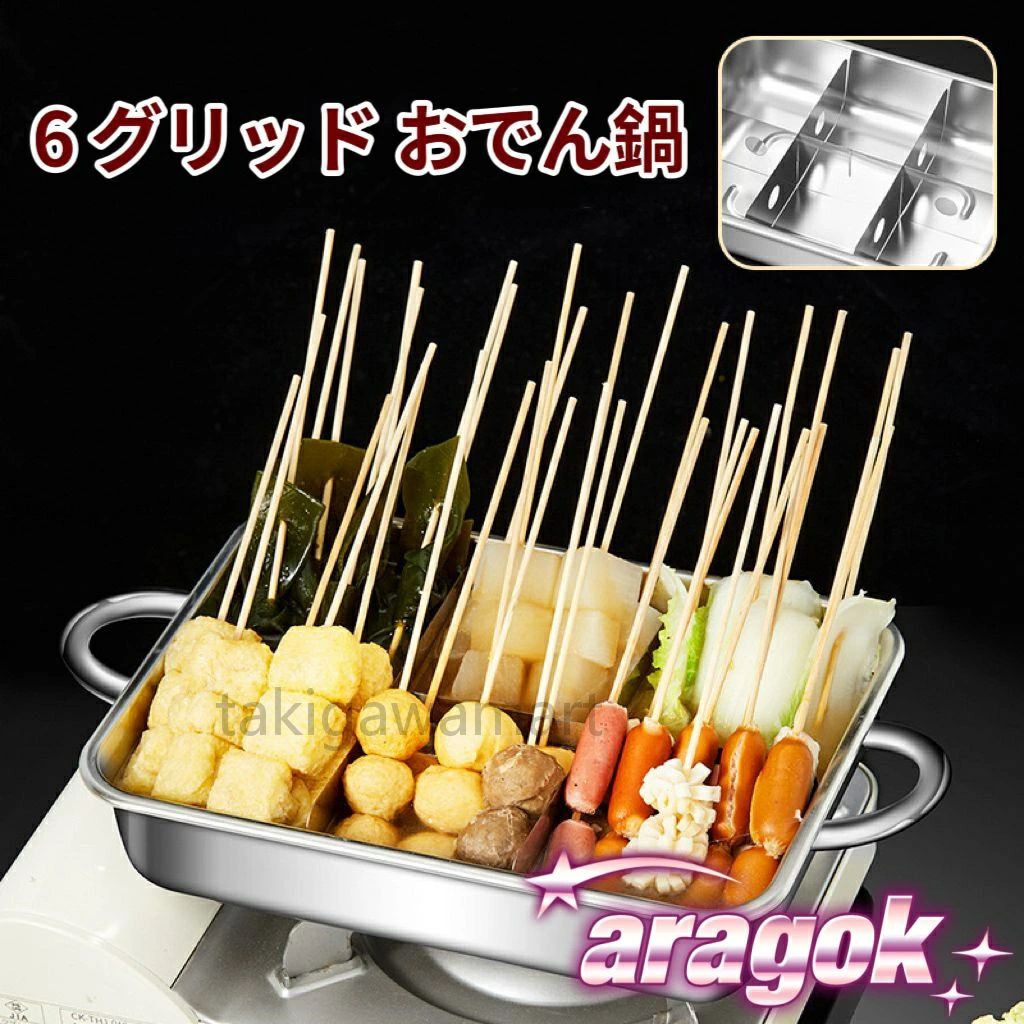 おでん鍋:6グリッド,仕切り付。IH/直火対応。仕切り取り外し可能。両手鍋デザイン,やけど防止と滑り止めハンドル、使いやすい。良質なステンレス板を採用して、丈夫で、熱の伝わりが良く、保温性に優れ。