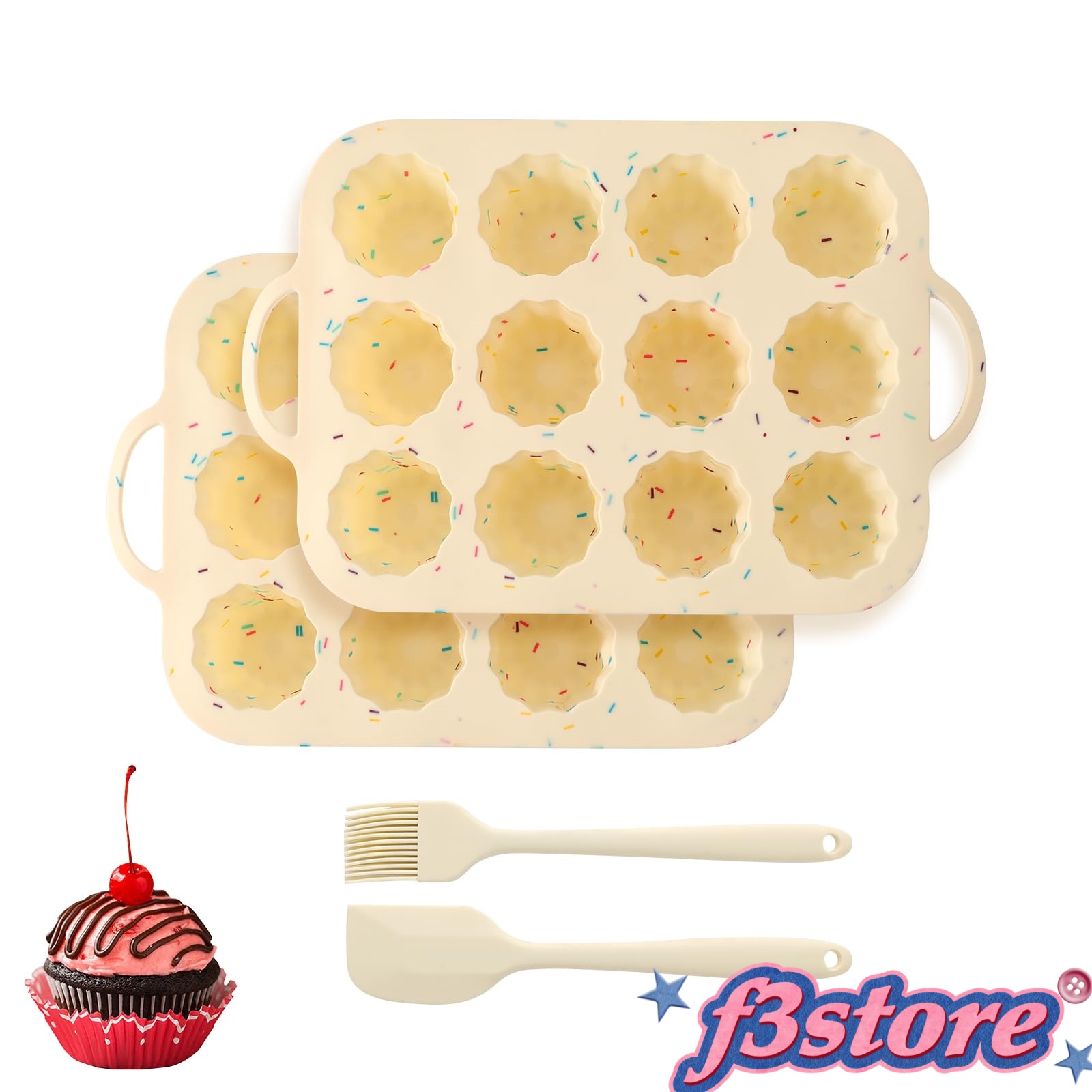 シリコーン製マフィン型2個セット シリコンスパチュラ1点とブラシ1点 ケーキ型12個 ミニカップケーキ型 ベーキング用シリコンマフィン型 マフィンケーキ