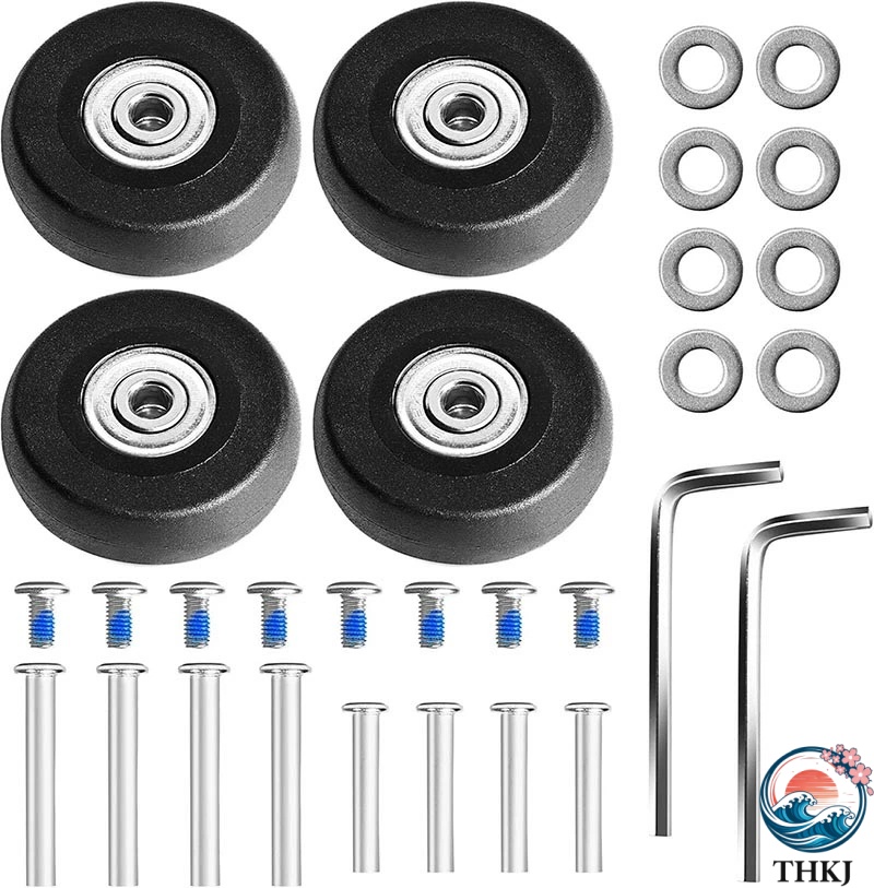 スーツケースタイヤ交換キット内容:[1]PUゴム交換用ホイール4 個:ホイールサイズは50/18 mm、内蔵ボールベアリング内径6 mm、全幅約20-21 mm。