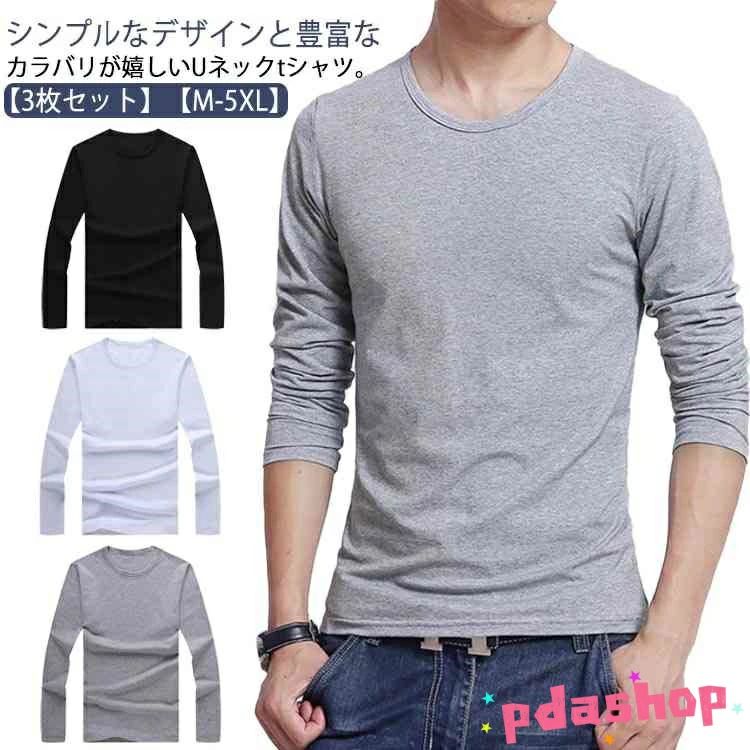 3点セット ロンt メンズ 春夏秋冬 ルームウェア 丸首 大きいサイズ Uネック インナー ロングtシャツ フィット ストレッチ 細身 長袖tシャツ
