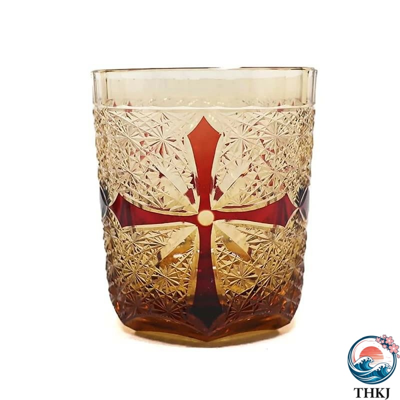 切子 ロックグラス 冷酒杯 十字と菊柄 260ml 手作り ウイスキーグラス 冷水グラス (琥珀色?黒)