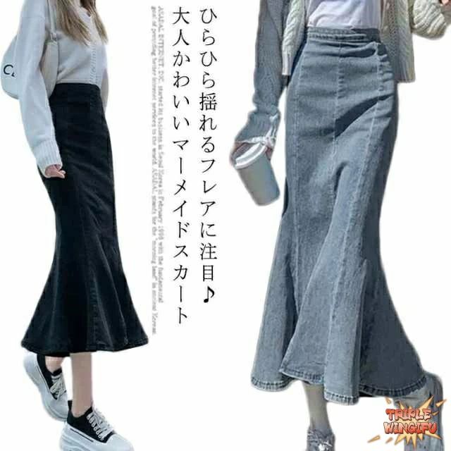 デニムスカート マーメード ロング スリット 黒 フレア タイトスカート ハイウエスト レディース 大人 ミモレ丈 薄手 膝下 タイト 細身 スリ