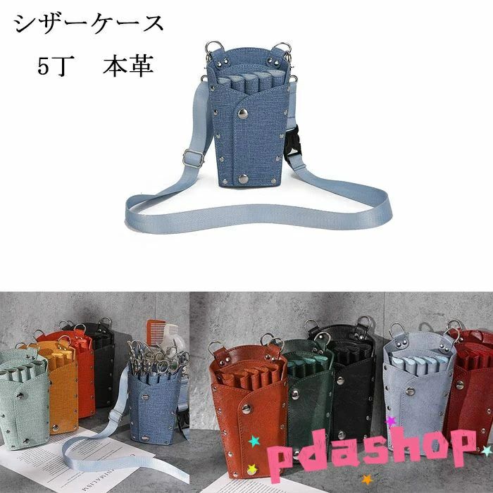 シザーケース ハサミ5丁 シザーバック デニム 本革 理容師 理髪師 美容師 トリマー用 ツール収納バッグ プロ用ヘアクリップ カットコーム収納ポーチ サロン 床