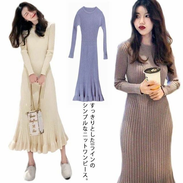 ロング丈 ロングニットワンピース フリル裾 ニットワンピース ニットワンピ マーメイド ミモレ丈 タイト 40代 aライン リブニット マーメイド
