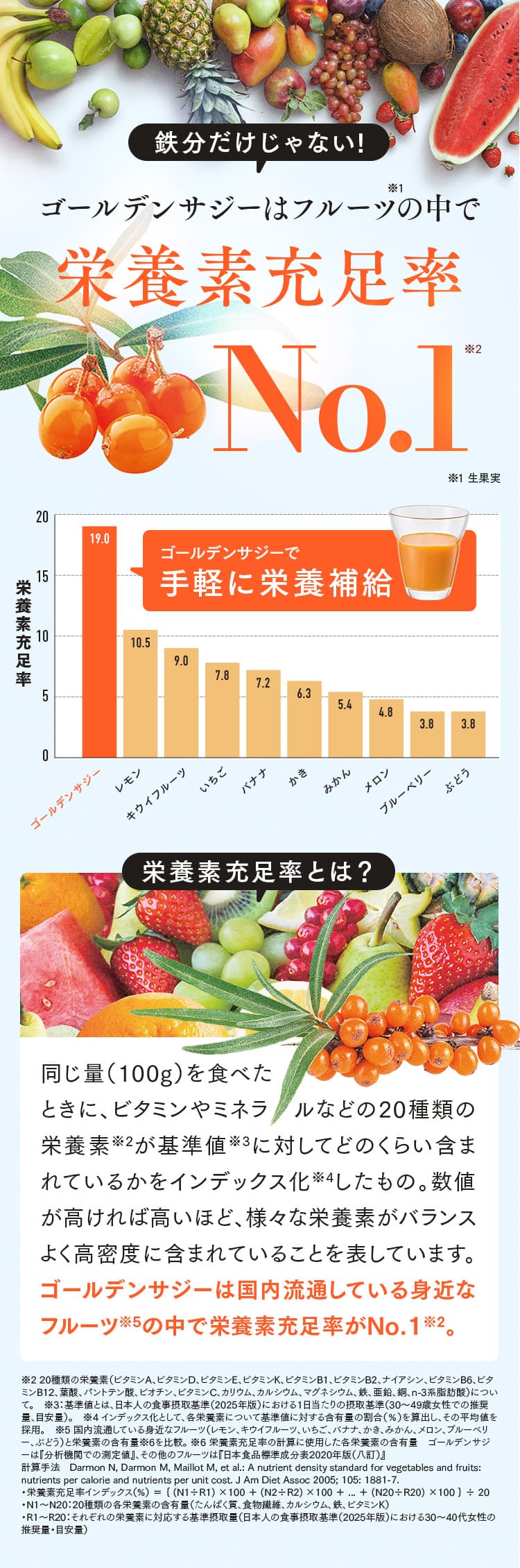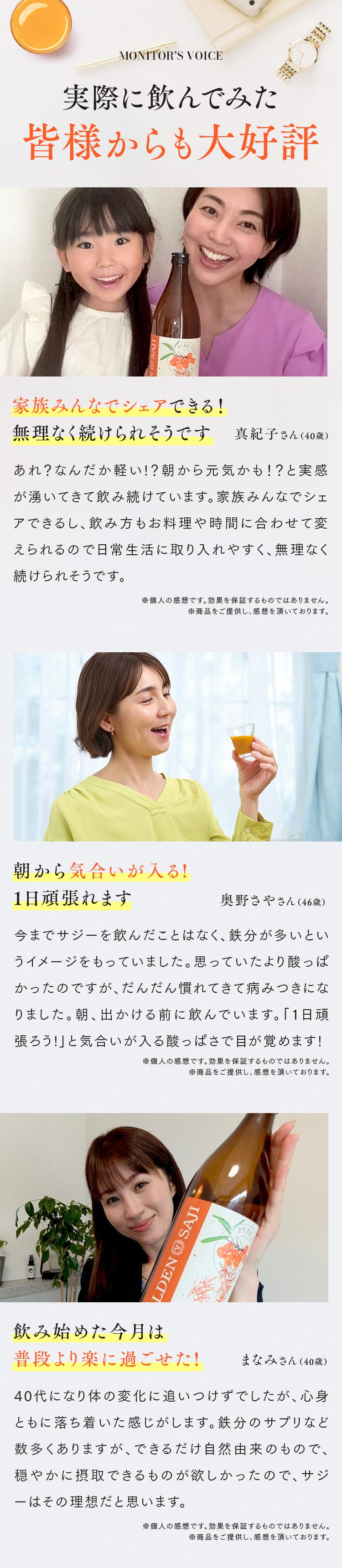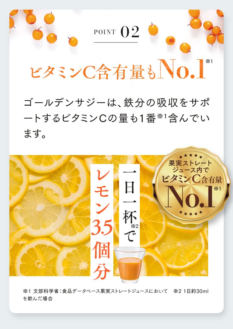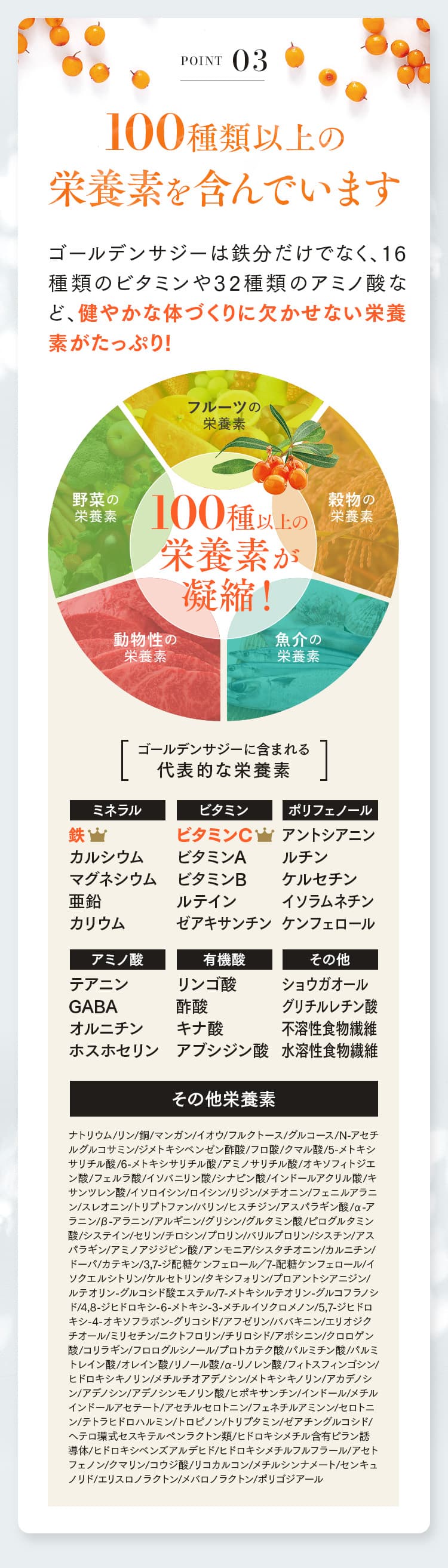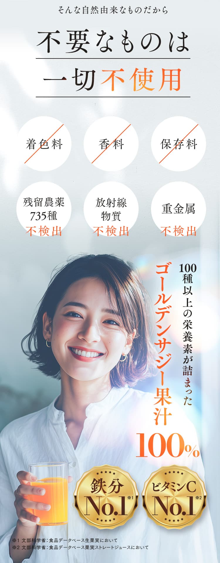 ●ゴールデンサジーは、標高1600Mの高山で日差しと雨の恵みを受け力強く育ち、乾燥して昼夜の寒暖差が大きいため果実の糖度を高め、豊かな甘みと深い味わいを生み出した結果、鉄分、ビタミンC、ポリフェノールをはじめとした豊富な栄養素がたっぷり。収穫直後に冷凍保存、さらにはコールドプレス製法でその栄養素を保ったまま純正サジー果汁100%として製品へ。