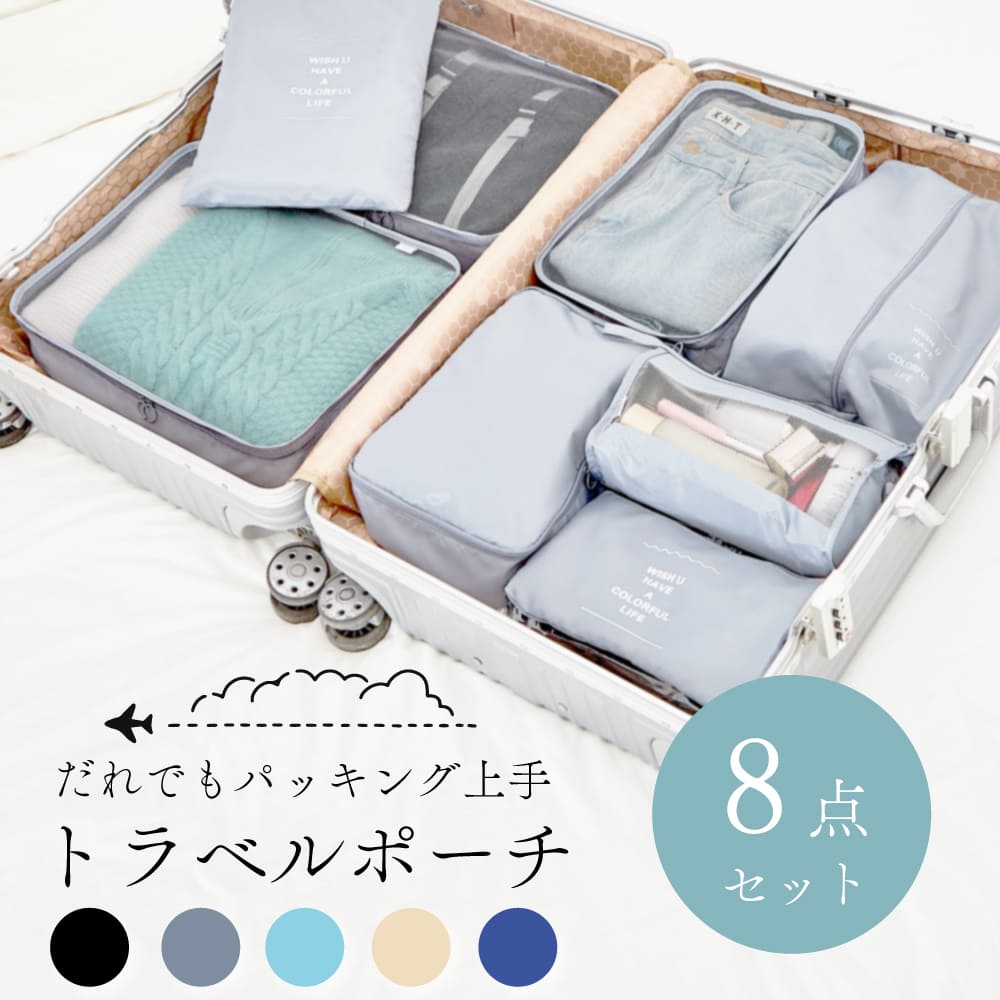 旅行の荷造りに便利なトラベルポーチ8点セット。