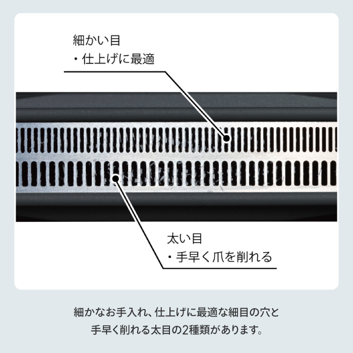 細かなお手入れ、仕上げに最適な細目の穴と手早く削れる太目の2種類があります。