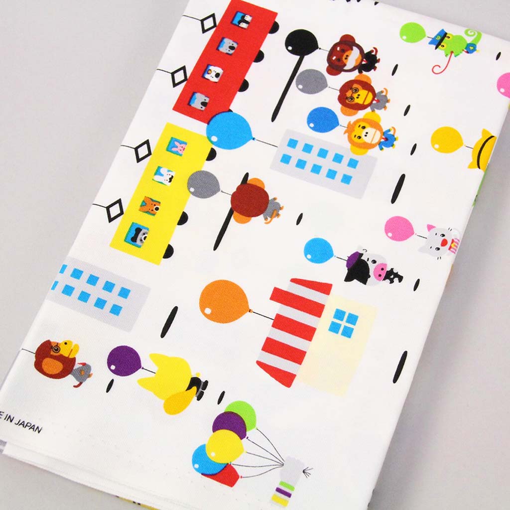 【完売終了】生地 キャラクター ハギレ(90cm~1m) オックス ふうせんいぬティニー 街並み(ホワイト) 布 G4508-A