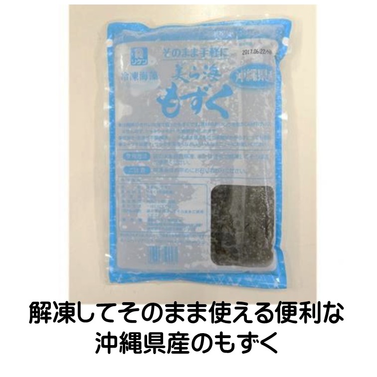 塩抜き・洗浄が不要で、解凍してそのまま使える便利な沖縄県産のもずくです。