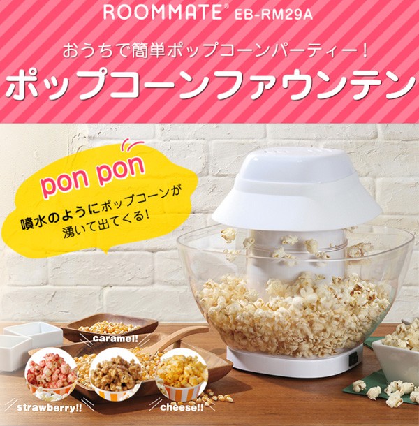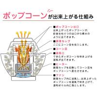 商品説明 | 全国送料無料!(沖縄、離島は出荷不可となります) おうちで簡単!ポップコーン パーティー コーン豆を入れてスイッチオン。約120秒で出来たてのポップコーンをご家庭で楽しめます。 ガス火などを使用しない電気式なので、難しい火加減の調整も不要です。 市販の味付けパウダーでさまざまな味を楽しめるのも、作りたてならでは。 キャラメル、チーズ、メープル、などなど…お好きなフレーバーで試してみてくださいね。 いつものおやつはもちろん、ホームパーティーなどにもピッタリ。 ヒーターで加熱して出来たポップコーンは、本体に内蔵されたファンで回転しながら上に上がり、前後左右4つの出口から噴水のように出てきます。 湧き出たポップコーンはセットしたボウルに自動的にたまるので、出来上がったらすぐに食べることができます。 一度に付属のカップ一杯(約75g)のコーン豆が調理でき、家族みんなでおなかいっぱい食べられます。 油を使わずに作れるのでとってもヘルシー。 専用のシリコンカバーが、熱くなった豆や出来上がったポップコーンを安全にボウルに落とします。 カバー、フタ、ボウルは本体から外して洗えるので、清潔に保つことができます。 【商品詳細】 サイズ:約幅28.8x奥行28.8x高さ17.8cm 重量:約1.3kg 電源コード長さ:約1.8m スイッチ:ON/OFF 電源:AC100V 50/60Hz 消費電力:1200W 主要材質:PP樹脂、PC樹脂、PA樹脂 付属品:カバー、蓋、ボウル、軽量カップ、取扱説明書、保証書 JANコード:4560481899921 |