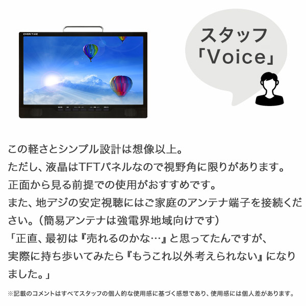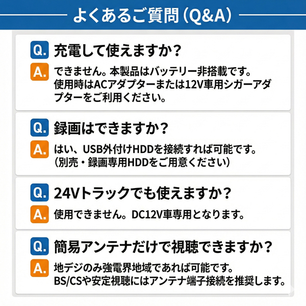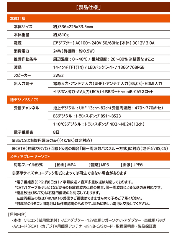 | 商品説明 | ━━━━━━━━━━━━━━━━ 「充電切れゼロ」の14型ポータブルテレビ登場 ━━━━━━━━━━━━━━━━ バッテリーをあえて外したら、 810gで一生劣化しない神モニターになった。 こんな人におすすめ! ■ 車や現場で“充電切れ”に悩まされたことがある ■ バッテリー内蔵型の劣化や熱が気になる ■ とにかく軽くて、すぐ使えるモニターがほしい ■ もうバッテリー式のポータブルテレビで失敗したくない人 「充電を忘れて見たい時に見られない」 「バッテリー交換=買い替えが怖い」 そんな悩みを逆転発想で解決しました。 ━━━━━━━━━━━━━━━━ バッテリー非搭載=不便? → 実は“最強”だった ━━━━━━━━━━━━━━━━ 一般的なポータブルテレビは充電式。 でも、バッテリーは劣化・発熱・重量のリスクも抱えています。 この製品はあえて「AC/DC電源式」にすることで、 ■ 重量わずか約810g ■ 劣化の心配なし ■ 常時安定電源で24時間視聴可能 電源があれば、そこがあなた専用の視聴スペースに。 「自宅でも車でもずっと使える」1台です。 ━━━━━━━━━━━━━━━━ 3つの注目ポイント ━━━━━━━━━━━━━━━━ ■ 地デジ・BS・110度CSの「3波対応」 話題のスポーツ中継や映画も自宅で気軽に視聴。 ※BS/CS視聴にはアンテナ端子接続が必要です。 ■ 3WAY設置で「車載・壁掛け・卓上」すべてOK 車載バッグ・スタンド・VESA壁掛け対応。 12Vシガーアダプターで車でも使えます。 ■ HDMI&USBで「録画・サブモニター」にも ゲーム・PC接続、外付けHDD録画も可能。 録画用USB-HDDは別途ご用意ください。 ━━━━━━━━━━━━━━━━ 実際に使ってみた感想 ━━━━━━━━━━━━━━━━ ■ テレワーク中のサブモニターとして活用。 ニュースも流せて「ながら視聴」が便利。 ■ 車内で子供用モニターとして大活躍。 充電切れの心配がなく、長距離移動も安心。 ■ 家族が寝たあと、自室で小さく映画鑑賞。 軽いから手軽に持ち運べて本当に快適です。 ━━━━━━━━━━━━━━━━ スタッフVoice ━━━━━━━━━━━━━━━━ この軽さとシンプル設計は想像以上。 ただし、液晶はTFTパネルなので視野角に限りがあります。 正面から見る前提での使用がおすすめです。 また、地デジの安定視聴にはご家庭のアンテナ端子を接続ください。 (簡易アンテナは強電界地域向けです) 「正直、最初は『売れるのかな…』と思ってたんですが、 実際に持ち歩いてみたら『もうこれ以外考えられない』になりました(笑)」 ━━━━━━━━━━━━━━━━ よくあるご質問(Q&A) ━━━━━━━━━━━━━━━━ Q. 充電して使えますか? A. できません。本製品はバッテリー非搭載です。 使用時はACアダプターまたは12V車用シガーアダプターをご利用ください。 Q. 録画はできますか? A. はい、USB外付けHDDを接続すれば可能です。 (別売・録画専用HDDをご用意ください) Q. 24Vトラックでも使えますか? A. 使用できません。DC12V車専用となります。 Q. 簡易アンテナだけで視聴できますか? A. 地デジのみ強電界地域であれば可能です。 BS/CSや安定視聴にはアンテナ端子接続を推奨します。 ━━━━━━━━━━━━━━━━ 最後にひとこと ━━━━━━━━━━━━━━━━ 使ってみたら全員が言った一言 「充電式に戻れない…」 コンセントかシガーソケットがあれば、どこでも即視聴。 もう充電残量を気にする人生は終わりです。 ━━━━━━━━━━━━━━━━ 製品スペック ━━━━━━━━━━━━━━━━ サイズ:W336×D33.5×H225mm(本体) 重量:約810g(本体) 液晶:14インチTFT(TN)パネル/LEDバックライト/1366×768RGB 電源:AC100-240V/DC12V 3.0A(バッテリー非搭載) 受信:地デジ(UHF 13-62ch)、BS、110°CS 入出力:アンテナ入力、HDMI、AV入力(RCA)、イヤホン出力、USB、miniB-CASスロット 付属品:本体、リモコン、ACアダプター、12V車用アダプター、車載バッグ、AVコード、簡易アンテナ、miniB-CAS、説明書、保証書 注意:4K/8K(左旋円偏波)非対応。録画には外付けHDDが必要です。 |