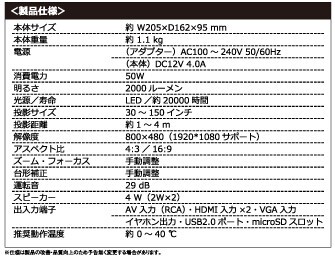 | 商品説明 | 【DVDプレーヤー搭載 進化系プロジェクター!】 LED PROJECTOR with DVDPlayer DVDプレーヤー搭載プロジェクター 電源を入れてお手持ちのDVDやCDを使えば、お部屋が簡単にホームシアターに早変わり! 写真や音楽などのデータを外部メモリーからすぐに楽しめるメディアプレーヤーも内蔵! もちろん外部機器からデータも大きなサイズ投影OK! 使い方もイロイロ!進化系プロジェクター! サイズ・容量 約W205×D162×95mm /約1.1kg 付属品:プロジェクター本体、リモコン、ACアダプター、AVケーブル(RCA)、取扱説明書、製品保証書 ■生産地:中国 ■素材・成分:アダプター電源:AC100〜240V 50/60HZ 本体電源:DC12V 4.0A 消費電力 50W 明るさ:2000ルーメン 光源/寿命 LED/約 2000 時間 投影サイズ:30〜150インチ 投影距離:約1〜4M |