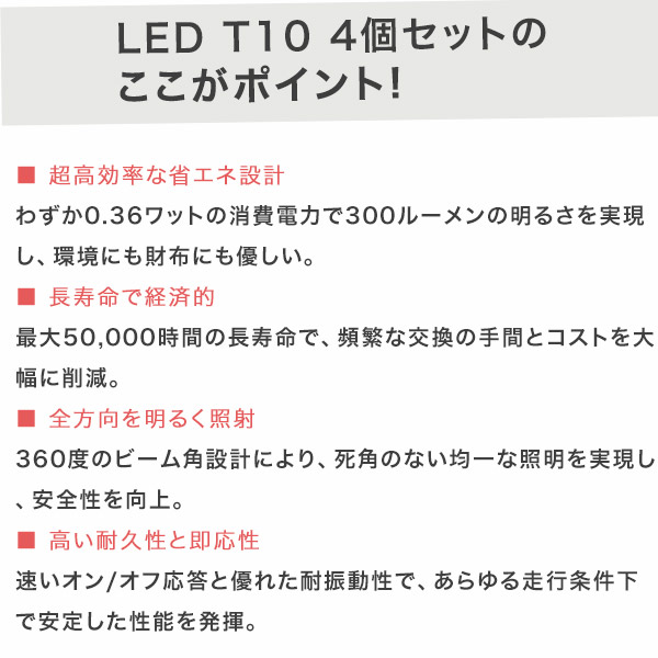 | 商品説明 | 省エネ&高輝度!車内外を明るく彩る次世代照明 わずか0.36ワットという驚異的な低消費電力ながら、300ルーメンの明るさを実現するLED T10 4個セット。 従来のハロゲンバルブと比較して約4分の1の消費電力でありながら4、その明るさは圧倒的です。T10規格は自動車の小型照明に広く使用される規格で、ポジションランプ(車幅灯)やルームランプなど、車内外の多くの箇所で活躍します。 \LED T10 4個セットのここがポイント/ ■超高効率な省エネ設計 わずか0.36ワットの消費電力で300ルーメンの明るさを実現し、環境にも財布にも優しい。 ■長寿命で経済的 最大50,000時間の長寿命で、頻繁な交換の手間とコストを大幅に削減。 ■全方向を明るく照射360度のビーム角設計により、死角のない均一な照明を実現し、安全性を向上。 ■高い耐久性と即応性 速いオン/オフ応答と優れた耐振動性で、あらゆる走行条件下で安定した性能を発揮。 【明るさ、省エネ、長寿命。すべてを兼ね備えた次世代LEDバルブですね!】 このLED T10バルブの最大の特徴は、360度全方向照射設計により、死角のない均一な照明を実現している点です。 これにより車内空間の視認性が大幅に向上し、夜間の運転時の安全性も高まります。また、1smd cobの高輝度LEDを採用することで、通常の白熱電球よりも明るい光を放ちます。 さらに、最大50,000時間という驚異的な長寿命設計により、従来の白熱電球の約40倍以上の寿命を実現。頻繁な交換の手間とコストを大幅に削減できるため、長期的に見ても非常にコストパフォーマンスに優れています。 幅広い用途で活躍する万能LED このLED T10 4個セットは、ポジションランプ(車幅灯)やナンバー灯、ルームランプ、カーテシランプ、トランク灯など、車内外の様々な場所で使用可能。サイズは9mm×23mmとコンパクトながら、その明るさと全方向照射性能で車内外を均一に照らします。 電圧12V、電流0.03A、消費電力0.36ワットという超低消費電力設計は、バッテリーへの負担を軽減し、燃費向上にも貢献します。 また、速いオン/オフ応答と優れた耐振動性により、あらゆる走行条件下でも安定した性能を発揮します。 省エネと高輝度を両立した次世代照明の実力に驚き!「従来のハロゲンバルブと交換したところ、明るさの違いに驚きました。 特に夜間のナンバー灯として使用した際、視認性が格段に向上し安心感が増しました。また、瞬時に点灯する即応性も魅力的です。4個セットで様々な場所に使えるコスパの良さも◎。車内照明をLEDに統一したい方にぜひおすすめしたい一品です! ・電圧:12v ・電流:0.03A ・電源:0.36ワット ・ルーメン:300LM ・LEDの数:1smd cob ・サイズ:9mm×23mm ・4個セット ※白光のみ 【商品特徴・キーワード】 LED T10 高輝度 省エネ LEDバルブ 長寿命 車用LED 360度照射 T10 低消費電力 ポジションランプ DIY カスタム LED 車用 LEDセット 【注意事項】 ※本商品には説明書が付属しておりません。使用方法に関しては商品ページをご参照ください。 ※商品画像はご覧になっているモニターやPCなどの環境、解像度により、実物と多少カラーが異なる場合がございます。色味やサイズが異なるなどのクレームはご対応致しかねますので、予めご了承ください。 ※輸送中に外装に傷やへこみが起こる場合がございますが、商品に影響はございませんので、予めご了承のもとお買い求めください。 ※本商品は海外からの輸入品ですので、細かい傷や汚れなどある場合がございます。予めご了承のもとお買い求めください。 ※こちらの商品は安価にご提供するため、簡易包装、簡易パッケージとなっております。 ※製造時期によって一部デザインが変更になる場合がございます。予めご了承のもとお買い求めください。 ※本商品に傷、歪み、破損などがあった場合には怪我、事故の恐れがありますので、直ちに使用を中止し破棄してください。 ※本商品はすべての環境、機器との使用を保証するものではございません。一部の機器では環境、相性等により使用できない場合がございます。予めご了承ください。 ※本商品を使用した事による、直接もしくは間接的に生じた損害、事故、怪我、故障について当店は一切の責任を負いません。 ※本商品は小さな部品を使用しております。誤飲等の危険性があるため、お子様がご利用になる場合は大人の方と一緒にご使用頂き、お子様の手の届かない場所で保管してください。 ※本商品はガラスを使用しており、割れやヒビが入った際に先端などで怪我をする可能性がございますので、お取り扱い時は十分に注意してご使用ください。 ※お子様の使用は事故、怪我の原因となりますので、手の届かない場所にて保管頂き、ご使用はお控えください。 ※直射日光に当たる場所、高温、火気のある場所には保管しないで下さい。 |