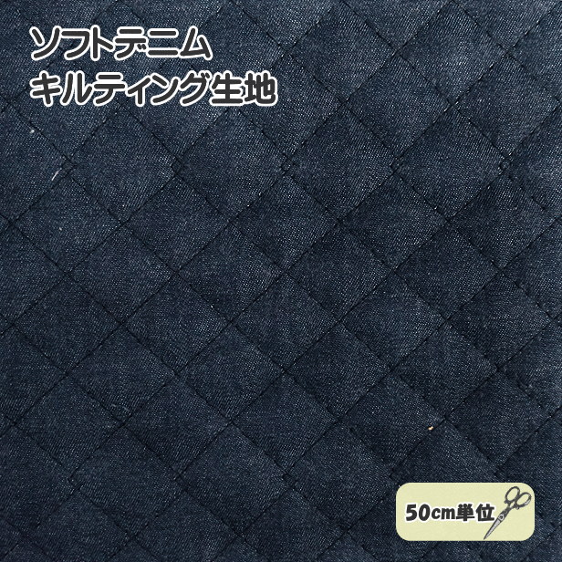 シンプルな無地のソフトデニム キルティング生地。薄手なのでご家庭のミシンでも縫いやすい。お子様の通園通学グッズ作りに!安心の国産。50cm単位の価格です。